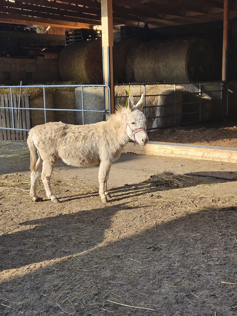 Snowi und Antje mussten von uns aufgenommen werden, da ihre Besitzerin sich auf Grund ihres eigenen hohen Alters nicht mehr ausreichend gut um die beiden kümmern konnte. Snowi ist ein zutraulicher, neugieriger Zwergeselwallach. Er mag Kinder und verträgt sich gut mit anderen Eseln, Mulis und Katzen. Er hängt sehr an Antje, weshalb er nur mit ihr gemeinsam vermittelt werden sollte. Als Snowi in unsere Pflegestelle kam, hatte er einen sehr langen Schnabelhuf hinten links. Inzwischen wurde dieser korrigiert, jedoch waren die Sehnen und Bänder durch die extreme Fehlstellung sehr lange sehr überdehnt worden, so dass es noch dauern wird, bis sie sich wieder etwas stabilisieren und er mit seinem Hinterhuf beim Gehen nicht mehr durchtrittig nach hinten kippt. Bei seiner Fütterung muss – wie bei allen Zwergeseln – zwingend darauf geachtet werden, dass er nicht mehr Energie zu sich nimmt, als er verbraucht. Aktuell bekommt er spät gemähtes Heu von mageren Wiesen ergänzt um Gerstenstroh. Weidegang ist für ihn als Zwergesel nur sehr eingeschränkt und nur auf mageren oder überständigen Flächen möglich.